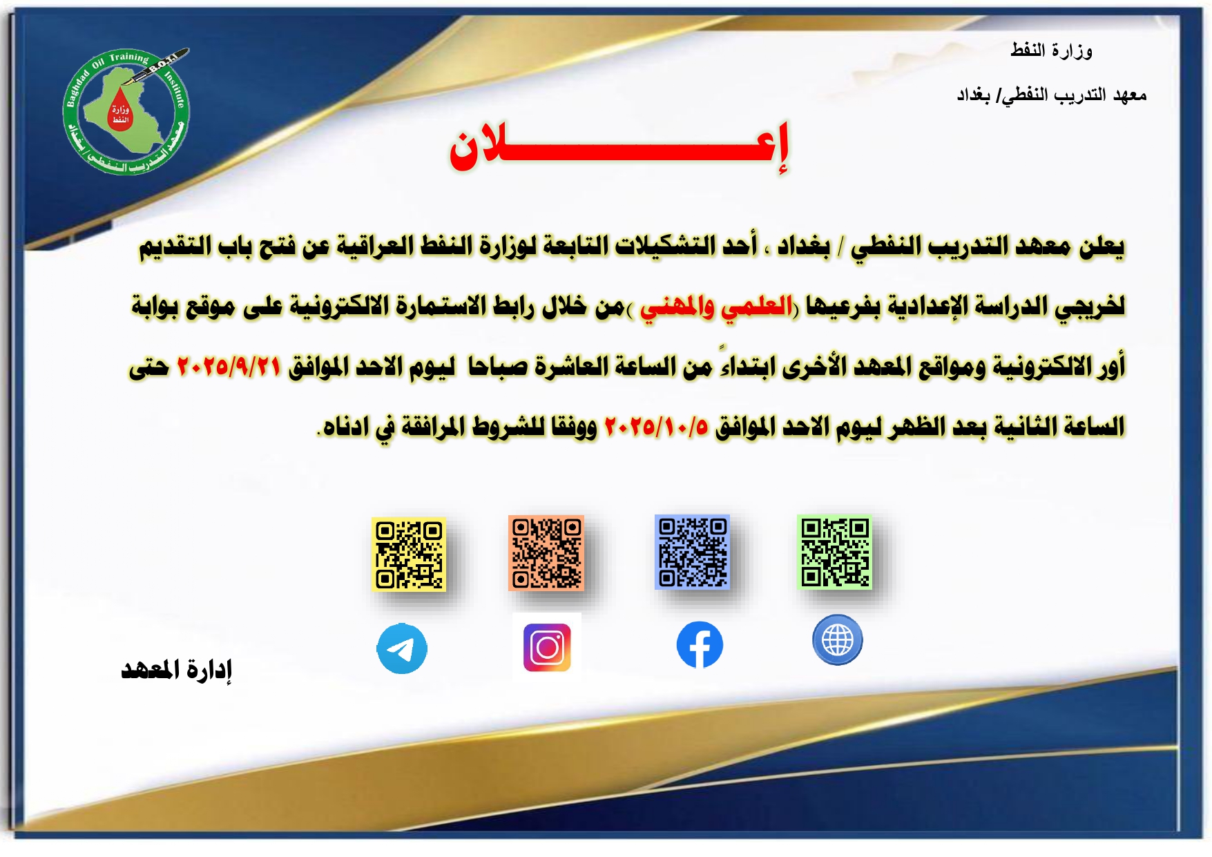 اعلان..اعلان..اعلان ... ييعلن معهد التدريب النفطي / بغداد ، أحد التشكيلات التابعة لوزارة النفط العراقية عن فتح باب التقديم لخريجي الدراسة الإعدادية بفرعيها (العلمي والمهني )من خلال رابط الاستمارة الالكترونية على موقع بوابة أور الالكترونية والمواقع الرسمية