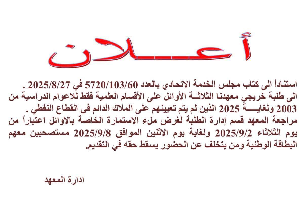 ...اعلان ...اعلان ...للطلبة الاوائل للسنوات من 2003الى 2025 لاغراض التقديم على التعيين بكتاب مجلس الخدمة الاتحادي