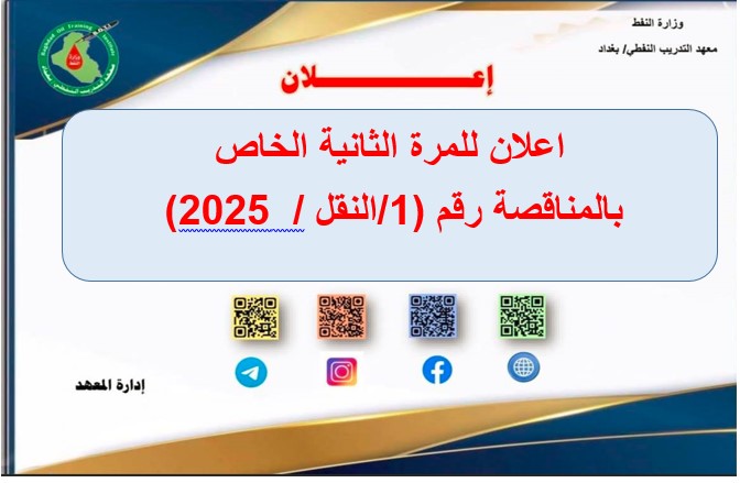 ...اعلان ...اعلان ....يعلن معهد التدريب النفطي بغداد عن المناقصة رقم 1 لعام 2025 /لنقل منتسبي المعهد