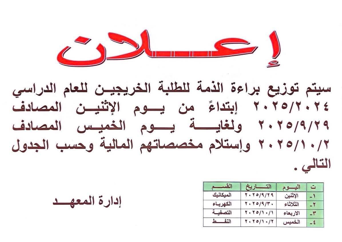 ..اعلان ...اعلان ...يعلن معهدنا عن توزيع براءات الذمة لخريجي 2024/2025 واستلام مخصصاتهم المالية ..