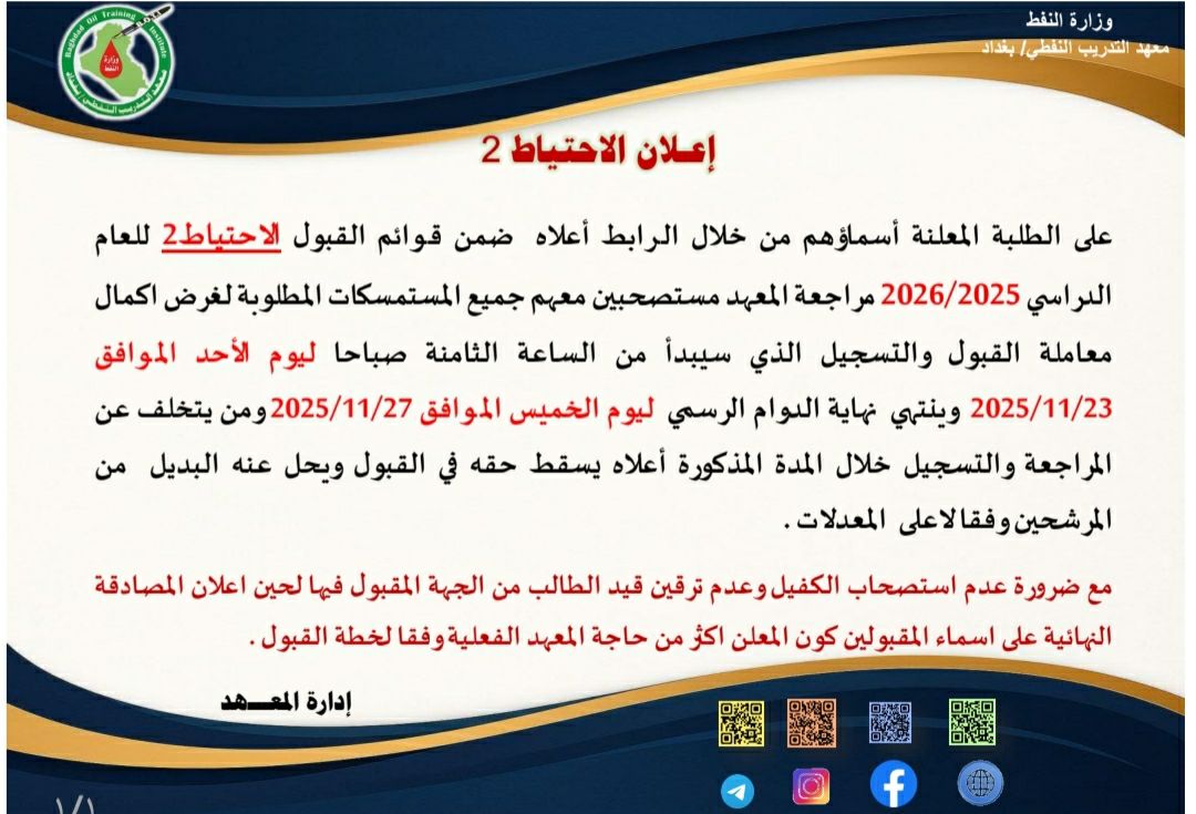 اعلان ....اعلان...على الطلبة المعلنة أسماؤهم في الجدول ادناه مراجعة المعهد لغرض اكمال معاملة القبول والتسجيل وذلك من يوم الخميس الموافق 27/11/2025 ولغاية نهاية الدوام الرسمي ليوم الاثنين الموافق 1/12/2025 مع ضرورة جلب الكفيل لاكمال معاملة القبول .